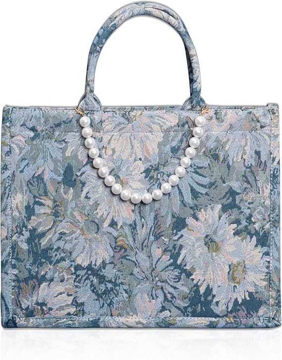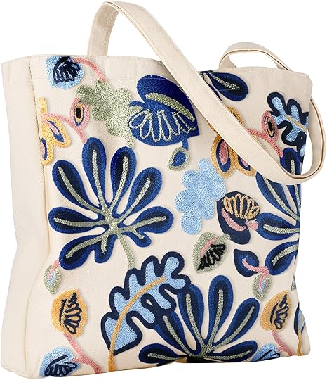 Aesthetic Embroidery Tote Bag for Women - Reusable Canvas Cute Shoulder Bag for Shopping, Grocery, Work, Book