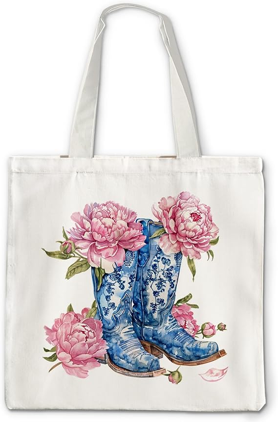 Chinoiserie Western Boots Canvas Tote Bag - Cowboy Boots Canvas Tote Bag for Women Men, Blue and White Floral Canvas Tote Bag