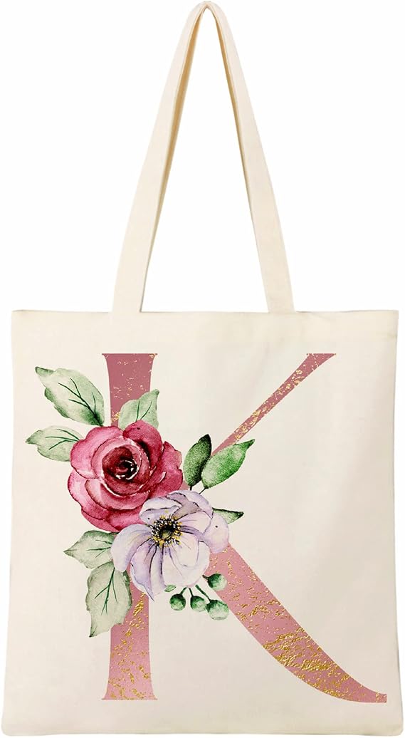 Initial Canvas Tote Bag Floral Letter Personalized Makeup Bag Monogrammed Gift for Bridesmaids Birthday Wedding