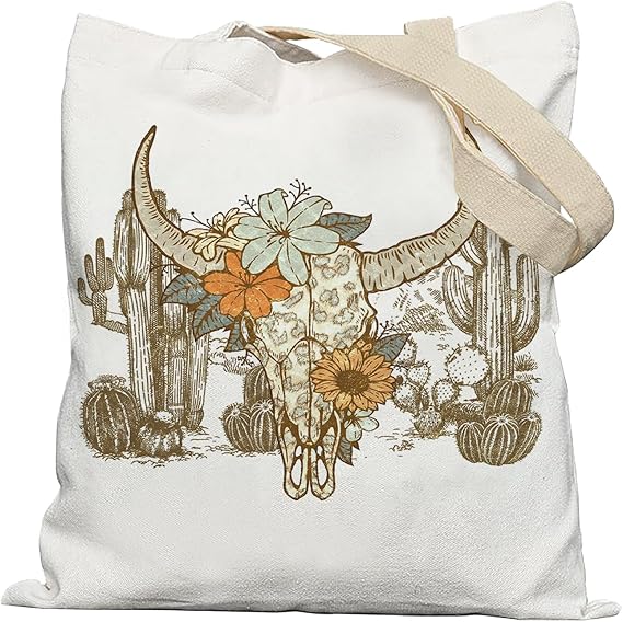 Western Tote Bag, Vintage Western Floral Bull Skull Canvas Tote Bags for Women, Western Gifts for Women, Cowgirl Gifts, Western