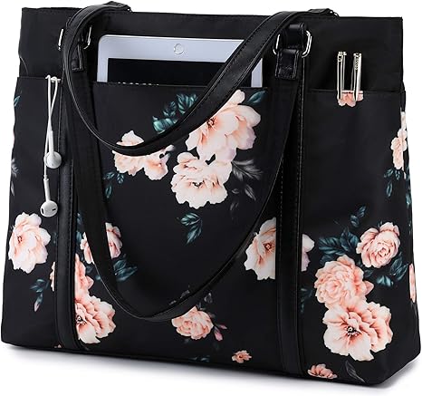 Laptop Tote Bag Womens Work Bags Purse Floral Teacher Handbag Shoulder Bag fit 15.6 in Laptop (Black - Peony Floral)